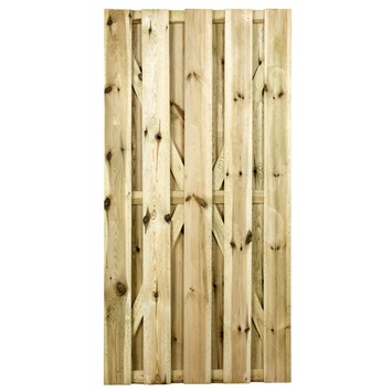 Deze poort kan het beste worden gecombineerd met een schutting van grenen hout, zoals schutting Solid. De poort heeft een standaard breedte van ongeveer 90 cm en de hoogte is 180 cm. De poort is gemaakt van 9 fijnbezaagde planken van 13 mm dik en 13,3 cm breed. Je kunt deze tuinpoort het beste ophangen met een hengenset, bestaande uit een plaatduim en een duimheng. Dit is bij KARWEI apart verkrijgbaar. Je kunt dan zelf kiezen of je deze poort links- of rechtsdraaiend plaatst.