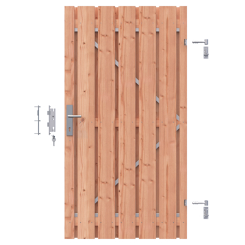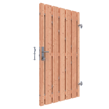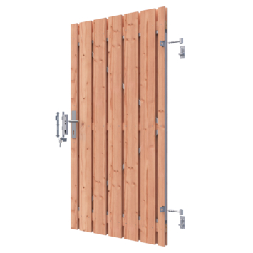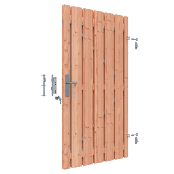 Het poortpakket Douglas is een bijpassend poort aan de schutting Douglas. De schutting Douglas is ook te verkrijgen in een gemakkelijk startpakket welke uit te breiden is met een volgpakket. . De poort is gemaakt van ruw Douglas hout en dient voor extra bescherming direct gebeitst te worden. De tuindeur bestaat uit 9 planken van ca. 15 bij 140 millimeter, die zijn bevestigd met RVS-schroeven. De poort heeft een standaard maat van ca. 180x90 cm en biedt gemiddelde privacy. Deze tuindeur kan zowel links- als rechtsdraaiend worden geplaatst. De tuinpoort heeft een metalen frame voor extra stevigheid.Het poortpakket wordt geleverd met een volledig deurbeslag set inclusief slotkast, profielcilinder en een slot met SKG keurmerk en bevestingsmateriaal.