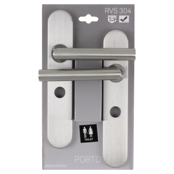 De deurkruk Porto langschild wc is van een hoge geborstelde RVS kwaliteit. Deurkruk. Type Porto RVS #304 kwaliteit geborsteld , op langschild voor wc, toilet of badkamer 63mm met stift 8mm. De deurklink is vast gemonteerd op het schild en is voorzien van een veer waardoor de kruk niet gaat hangen. In deze serie is ook een blind schild, sleutel 56mm en een rond rozet beschikbaar. Geen afwijkende maten voor WC, sleutel en cilinder beschikbaar.