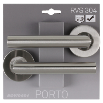 De deurkruk Porto rond rozet is van een hoge geborstelde RVS kwaliteit. De deurklink is vast gemonteerd op het rozet en is voorzien van een veer waardoor de kruk niet gaat hangen. Sleutel- en cilinderplaatje en WC garnituur en blind schild, sleutel 56mm en WC 63/8 beschikbaar. Geen afwijkende maten voor WC, sleutel en cilinder beschikbaar.