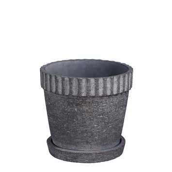 Met deze mooi bloempot voeg je een vleugje natuurlijke- en rustgevende sfeer toe aan je omgeving. Het is een ronde pot die is voorzien van een gestreepte rand. Hij is vervaardigd uit cement waardoor hij wat zwaarder en daardoor ook stevig en stabiel is. De bijpassende schotel zorgt ervoor dat overtollig water opgevangen wordt en er geen vochtkringen op de vloer gevormd worden. De bloempot heeft een antraciet kleur en een afmeting van 15 cm hoog met een diameter van 15,5 cm.