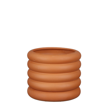 Verrijk je interieur met deze kunstzinnige bloempot. Het is een ronde pot met een rechte buitenzijde. Deze zijde bestaat uit vijf ringen wat hem een golvende uitstraling geeft. Hij is bruin van kleur wat hem een natuurlijke uitstraling geeft. Hij is vervaardigd uit terracotta en heeft een hoogte van 11 cm met een diameter van 15 cm. Hij is voorzien van een handige schotel waardoor overtollig water wordt opgevangen. De pot staat niet alleen mooi in huis, ook op het balkon of in de tuin misstaat deze pot absoluut niet.