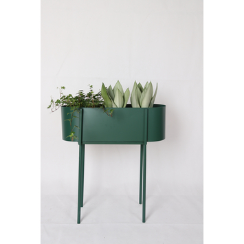De meeste bloempotten worden op de vensterbank, op de tafel of op de grond geplaatst. Dit maakt dat ze bijna altijd allemaal op dezelfde hoogte staan en er een risico is op kringen op de ondergrond. Met deze bloempot op standaard breng je een andere dimensie aan in de planten ordening in huis waardoor er een speels karakter aan je interieur wordt toegevoegd. Bijkomend voordeel is dat vochtkringen gemengd met aarde tot de verleden tijd behoren. Deze bloempot op standaard is gemaakt van donkergroen ijzer en heeft een afmeting van 58cm lang, 24,5 cm breed en 66 cm hoog.