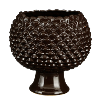 Deze elegante bloempot trekt onmiddellijk de blik door zijn opmerkelijke ontwerp. Gemaakt van robust keramiek en omhuld in een warme, donkerbruine kleur. Het reliëfpatroon over de gehele oppervlakte doet denken aan een dennenappel en de verfijnde voet waarop hij rust springt direct in het oog. Met afmetingen van H38 x ø38 cm biedt deze bloempot voor binnen voldoende ruimte voor al jouw groene creaties. Let op: Omdat dit een handgemaakt product is, kan de kleur, maat of vorm bij ieder item iets afwijken. Daarnaast zijn keramieken potten poreus en nooit 100% waterdicht.