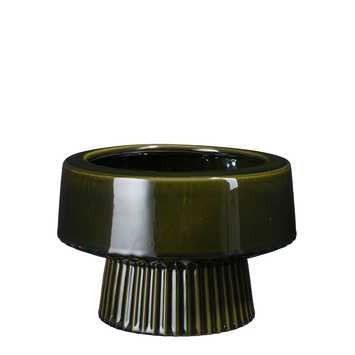 De bloempot heeft een aparte vormgeving met smalle onderkant die voorzien is van ribbels en een bovenkant die breder uitvalt. De prachtige donkergroene kleur zorgt voor een natuurlijke uitstraling en gaat mooi samen met je favoriete plant. Deze pot voor binnen is vervaardigd van stevig keramiek en past in elke woonstijl. Hij heeft een hoogte van 14,5 cm en een diameter van 20 cm en staat ook zelf zonder plant in mooi als decoratiestuk.