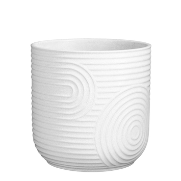 In elke moderne woning mag deze abstracte bloempot zeker niet ontbreken. Het is een volledig witte bloempot die is voorzien van strakke horizontale lijnen. Deze lijnen worden hier en daar onderbroken door ronde lijnen van hetzelfde karakter. De buitenzijde is dus niet glad maar voorzien van een prachtig reliëf. Het geheel is gemaakt van keramiek en heeft een afmeting van 21 cm hoog met een diameter van eveneens 21 cm.