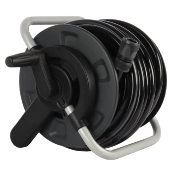 Deze zwarte tuinslang die je makkelijk oprolt door de hendel te gebruiken, valt ook op door zijn moderne uitstraling. Er is gekozen voor een fraaie zwarte look, die wordt aangevuld met een lichtgrijze stalen behuizing. De behuizing zorgt voor een solide stevige plek op de ondergrond. Om die strak afgewerkte look te behouden, is er in de haspel ruimte om alle accessoires op te bergen. Dat oogt niet alleen netjes, het geeft ook nog eens gemak omdat je de accessoires altijd bij de hand hebt. Zorg dat je de tuinslang tijdens gebruik niet te veel verschuift. Zet het model eventueel op een zachte ondergrond of bescherm de haspel tegen slijtage door een bescherming eronder te leggen.