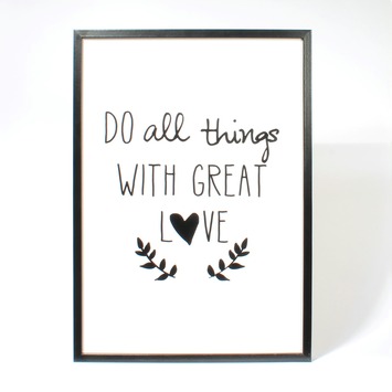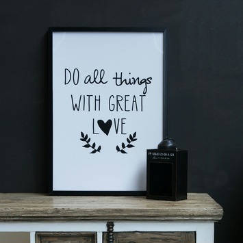 Print in frame - Do all things with great love 50x70 cm is een witte print met zwarte letters en past vrijwel in elk stijlvol en modern interieur op de muur. De tekst 'Do all things with great love' is afkomstig uit het Engels en betekent 'Doe alle dingen met grote liefde'. Een positieve tekst om in huis te hangen. Het frame is 70 centimeter hoog en 50 centimeter breed.