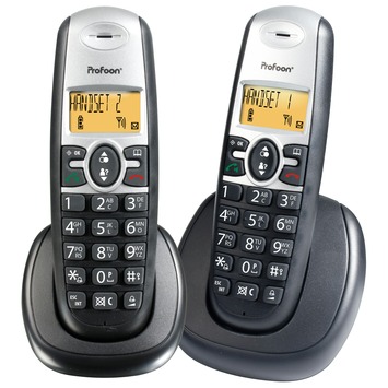 Deze Profoon DECT telefoon PDX-6520 twinset zwart zijn 2 handzame telefoons en bieden vele voorzieningen en mogelijkheden, zoals handsfree bellen, naam- en nummerweergave, telefoonboek voor 50 contacten, nummerherhaling voor de 10 laatst gekozen nummers, instelbare hoorn-, bel- en luidsprekervolume, een laag batterijverbruik (100 uur stand-by en 10 uur praten). De Profoon DECT telefoon PDX-6520 basisstation is GAP-compatibel, uitbreidbaar met maximaal 5 handsets.