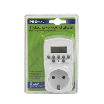 De Promax tijdschakelklok mini is een eenvoudige digitale tijdschakelaar. De tijdschakelaar zorgt ervoor dat elektrische apparaten automatisch in-of uitschakelen op de tijd die jij instelt. Danzij het gemakkelijke programma kun je de schakelaar tot op de minuut instellen voor verschillende dagen in de week. De tijdschakelklok is gemaakt van kunststof en daarom makkelijk schoon te maken. Kortom: een handig hulpmiddel voor in huis.