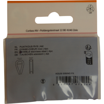Puntkous voor koord of kabel van 3mm. De puntkous is ideaal voor het maken van een lus aan het uiteinde van een koord of kabel. Ook geschikt om de koord te beschermen tegen doorslijten bij veelvuldige wrijving. De puntkous wordt dikwijls gecombineerd met een draadklem. Door het gebruik van roestvast staal is deze puntkous volledig beschermd tegen roestvorming waardoor hij in goede staat blijft en een lange levensduur gegarandeerd is. Set van 4 stuks in blister.