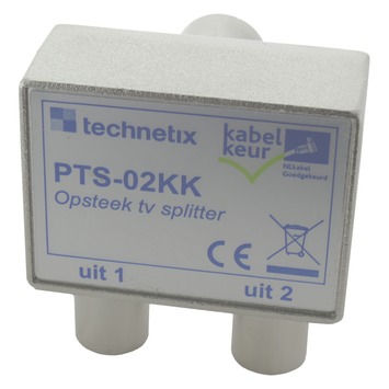 Q-Link opsteek tv-splitter met kabelkeur voor het splitsen van een antennesignaal. De splitter wordt direct aangesloten op een coaxaansluitpunt. De opsteek IEC-2-wegverdeler kabelkeur is 4-voudig HF afgeschermd. Door zijn metalen behuizing heeft de splitter een betere afscherming tegen stoorsignalen. Een splitter met kabelkeur wordt aanbevolen door UPC/Ziggo.