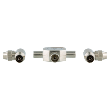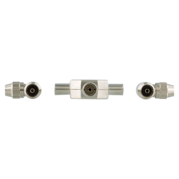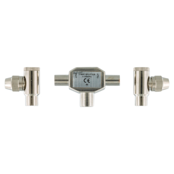De TV-splitter met twee stekkers is perfect voor het uitbreiden van een enkele female-aansluiting naar twee male-aansluitingen. De male-stekker beschikt over een dichte middenpen, terwijl de female-stekker een open middenpen heeft. Deze splitter biedt een praktische oplossing om verschillende apparaten, zoals een televisie en een radio, aan te sluiten op één signaalbron.