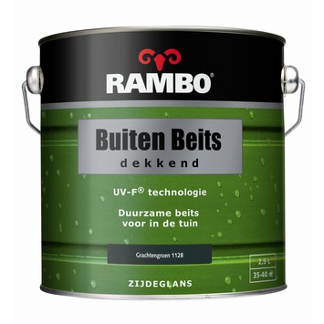 De Rambo buitenbeits grachtengroen dekkend 2,5 l is een buitenbeits met uv bescherming. De beits is impregnerend en trekt diep in de ondergrond, hierdoor is het een duurzame en vochtwerende beits voor kwalitatief hout in de tuin. De beits is geschikt voor het gronden, voorlakken en aflakken van vrijstaand houtwerk in de tuin zoals schuren, schuttingen, hekken, hokken, pergola’s en speeltoestellen. De beits heeft een uitstekende dekking en is makkelijk te verwerken. Het blik bevat 2,5 liter grachtengroene beits, dit is genoeg voor een oppervlakte van zo'n 35 tot 40 vierkante meter. De Rambo buitenbeits is in vele kleuren verkrijgbaar.