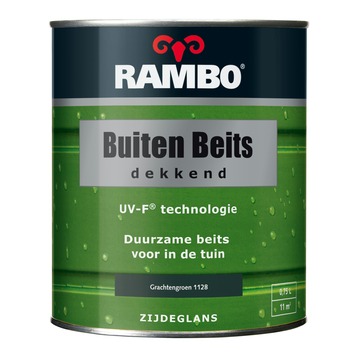 De Rambo buitenbeits grachtengroen dekkend 750 ml is een buitenbeits met uv bescherming. De beits is impregnerend en trekt diep in de ondergrond, hierdoor is het een duurzame en vochtwerende beits voor kwalitatief hout in de tuin. De beits is geschikt voor het gronden, voorlakken en aflakken van vrijstaand houtwerk in de tuin zoals schuren, schuttingen, hekken, hokken, pergola’s en speeltoestellen. De beits heeft een uitstekende dekking en is makkelijk te verwerken. Het blik bevat 750 milliliter grachtengroene beits, dit is genoeg voor een oppervlakte van zo'n 11 vierkante meter. De Rambo buitenbeits is in vele kleuren verkrijgbaar.