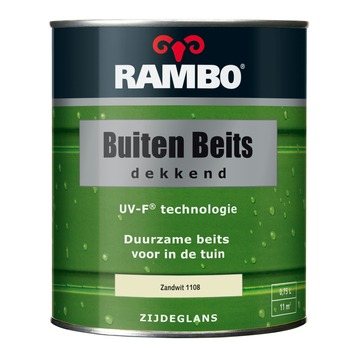 De Rambo buitenbeits zandwit dekkend 750 ml is een buitenbeits met uv bescherming. De beits is impregnerend en trekt diep in de ondergrond, hierdoor is het een duurzame en vochtwerende beits voor kwalitatief hout in de tuin. De beits is geschikt voor het gronden, voorlakken en aflakken van vrijstaand houtwerk in de tuin zoals schuren, schuttingen, hekken, hokken, pergola’s en speeltoestellen. De beits heeft een uitstekende dekking en is makkelijk te verwerken. Het blik bevat 750 milliliter zandwitte beits, dit is genoeg voor een oppervlakte van zo'n 11 vierkante meter. De Rambo buitenbeits is in vele kleuren verkrijgbaar.