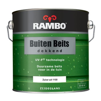 De Rambo buitenbeits zuiver wit dekkend 2,5 l is een buitenbeits met uv bescherming. De beits is impregnerend en trekt diep in de ondergrond, hierdoor is het een duurzame en vochtwerende beits voor kwalitatief hout in de tuin. De beits is geschikt voor het gronden, voorlakken en aflakken van vrijstaand houtwerk in de tuin zoals schuren, schuttingen, hekken, hokken, pergola’s en speeltoestellen. De beits heeft een uitstekende dekking en is makkelijk te verwerken. Het blik bevat 2,5 liter zuiver witte beits, dit is genoeg voor een oppervlakte van zo'n 35 tot 40 vierkante meter. De Rambo buitenbeits is in vele kleuren verkrijgbaar.