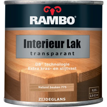 De Rambo interieur lak zijdeglans naturel beuken transparant 250 ml is een verfraaiende transparante interieurlak. De lak zorgt voor een mooie afwerking van bijvoorbeeld meubels, kozijnen, deuren en betimmeringen. Door de Dual Binder technologie is de lak kras- en slijtvast. Daarnaast is de lak eenvoudig aan te brengen, droogt het snel en is het reukarm. Het blik bevat 250 milliliter transparante lak in de kleur naturel beuken, dit is genoeg voor een oppervlakte van zo'n 2,5 tot 3,5 vierkante meter. De lak heeft een zijdeglanzende afwerking. De Rambo transparante interieur lak is verkrijgbaar in diverse kleuren.