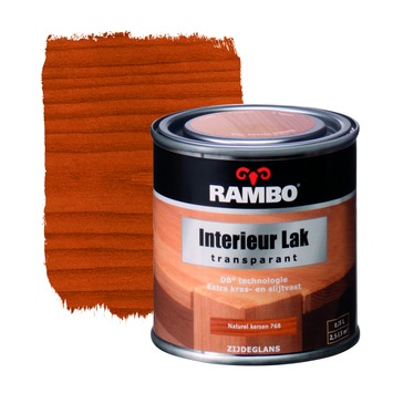 De Rambo interieur lak zijdeglans naturel kersen transparant 250 ml is een verfraaiende transparante interieurlak. De lak zorgt voor een mooie afwerking van bijvoorbeeld meubels, kozijnen, deuren en betimmeringen. Door de Dual Binder technologie is de lak kras- en slijtvast. Daarnaast is de lak eenvoudig aan te brengen, droogt het snel en is het reukarm. Het blik bevat 250 milliliter transparante lak in de kleur naturel kersen, dit is genoeg voor een oppervlakte van zo'n 2,5 tot 3,5 vierkante meter. De lak heeft een zijdeglanzende afwerking. De Rambo transparante interieur lak is verkrijgbaar in diverse kleuren.