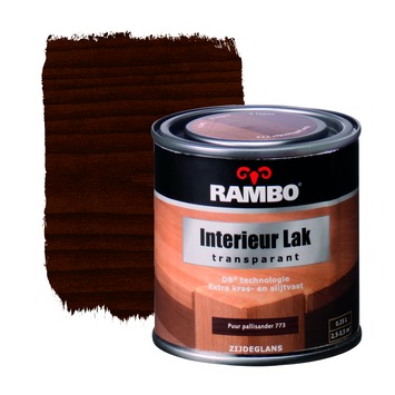 De Rambo interieur lak zijdeglans puur palissander transparant 250 ml is een verfraaiende transparante interieurlak. De lak zorgt voor een mooie afwerking van bijvoorbeeld meubels, kozijnen, deuren en betimmeringen. Door de Dual Binder technologie is de lak kras- en slijtvast. Daarnaast is de lak eenvoudig aan te brengen, droogt het snel en is het reukarm. Het blik bevat 250 milliliter transparante lak in de kleur puur palissander, dit is genoeg voor een oppervlakte van zo'n 2,5 tot 3,5 vierkante meter. De lak heeft een zijdeglanzende afwerking. De Rambo transparante interieur lak is verkrijgbaar in diverse kleuren.