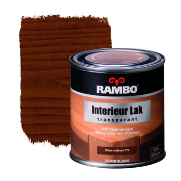 De Rambo interieur lak zijdeglans warm walnoot transparant 250 ml is een verfraaiende transparante interieurlak. De lak zorgt voor een mooie afwerking van bijvoorbeeld meubels, kozijnen, deuren en betimmeringen. Door de Dual Binder technologie is de lak kras- en slijtvast. Daarnaast is de lak eenvoudig aan te brengen, droogt het snel en is het reukarm. Het blik bevat 250 milliliter transparante lak in de kleur warm walnoot, dit is genoeg voor een oppervlakte van zo'n 2,5 tot 3,5 vierkante meter. De lak heeft een zijdeglanzende afwerking. De Rambo transparante interieur lak is verkrijgbaar in diverse kleuren.