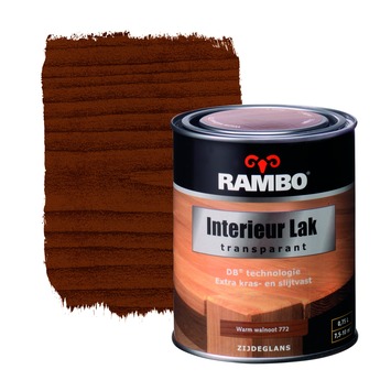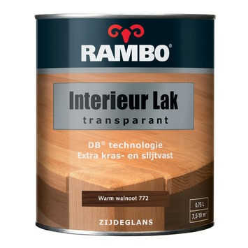 De Rambo interieur lak zijdeglans warm walnoot transparant 750 ml is een verfraaiende transparante interieurlak. De lak zorgt voor een mooie afwerking van bijvoorbeeld meubels, kozijnen, deuren en betimmeringen. Door de Dual Binder technologie is de lak kras- en slijtvast. Daarnaast is de lak eenvoudig aan te brengen, droogt het snel en is het reukarm. Het blik bevat 750 milliliter transparante lak in de kleur warm walnoot, dit is genoeg voor een oppervlakte van zo'n 7,5 tot 10 vierkante meter. De lak heeft een zijdeglanzende afwerking. De Rambo transparante interieur lak is verkrijgbaar in diverse kleuren.