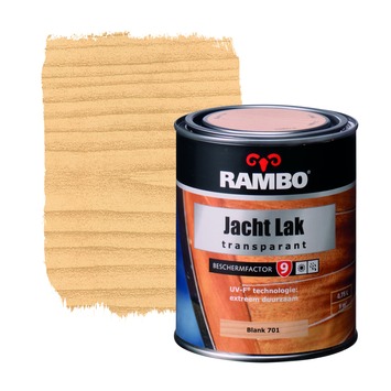 De Rambo jachtlak blank transparant 750 ml is een lak geschikt voor het blank afwerken van hout buiten en de houten opbouw van boten. Zo is de lak geschikt voor deuren, daklijsten, betimmeringen, kozijnen, kajuiten en houten boten boven de waterlijn. Ook kun je de lak binnen gebruiken voor kozijnen, deuren en betimmeringen. De lak biedt het hout de sterkst mogelijke transparante bescherming en geeft het hout een langhoudende glans. Het blik bevat 750 milliliter jachtlak, dit is genoeg voor een oppervlakte van zo'n 9 vierkante meter.