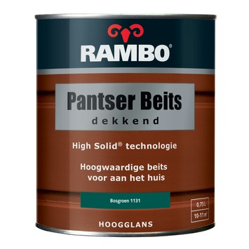 De Rambo Pantser beits hoogglans bosgroen dekkend 750 ml zorgt voor de beste bescherming voor duurzaam hout. De Pantser beits is een vochtwerende kwaliteitsbeits geschikt voor het houtwerk aan huizen. Gebruik deze beits voor het gronden, voorlakken en aflakken van houtwerk aan huizen zoals kozijnen, ramen, deuren, betimmeringen en daklijsten. De beits heeft een goede dekking, is weersbestendig en heeft een uitstekende duurzaamheid. Daarnaast is de beits makkelijk aan te brengen en vloeit het gelijkmatig uit. De beits is bosgroen van kleur en heeft een hoogglans afwerking. Het blik bevat 750 milliliter beits, dit is genoeg voor een oppervlakte van zo'n 10 tot 11 vierkante meter.