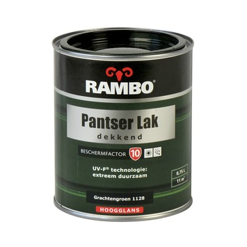 De Rambo Pantser lak hoogglans grachtengroen dekkend 750 ml is een duurzame lak voor de mooiste afwerking van het hout aan het huis. De lak is geschikt voor het aflakken van hout en andere ondergronden buiten zoals deuren, daklijsten, kozijnen en gevelbetimmeringen, die al voorzien zijn van een (grond)verflaag. Tevens is de lak binnen te gebruiken op een van grondverf voorziene plamuurlaag. De lak heeft een uitstekende dekking, is weersbestendig en is makkelijk aan te brengen. De lak is grachtengroen van kleur en heeft een hoogglans afwerking. Het blik bevat 750 milliliter dekkende lak, dit is genoeg voor een oppervlakte van zo'n 11 vierkante meter.