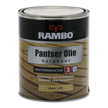 De Rambo Pantser olie hardhout blank 750 ml is een hoogwaardige olie voor hardhout. Het beschermt het hout tegen vocht en verwering en voorkomt mosvorming en vergrijzing. De olie is geschikt voor schuttingen, tuinbanken, plantenbakken en tuinhout. Je kunt de olie gemakkelijk aanbrengen. Het blik bevat 750 milliliter blanke olie, dit is genoeg voor een oppervlakte van zo'n 12 tot 15 vierkante meter.