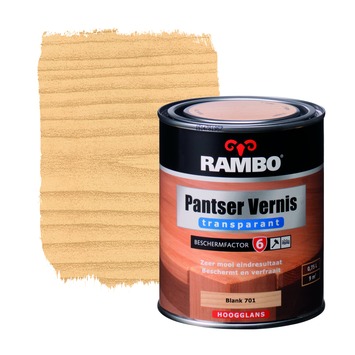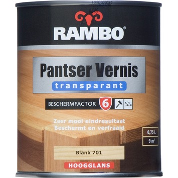 De Rambo Pantser vernis acryl hoogglans blank 750 ml is een vernis die zorgt voor een fraaie houtafwerking. De vernis geeft al je hout binnenshuis een bescherming en geeft een mooie hoogglans afwerking. Het is geschikt voor meubels, kozijnen, deuren en betimmeringen binnenshuis. De vernis op waterbasis droogt snel en is reukarm. Het blik bevat 750 milliliter blanke vernis, dit is genoeg voor een oppervlakte van zo'n 12 vierkante meter.