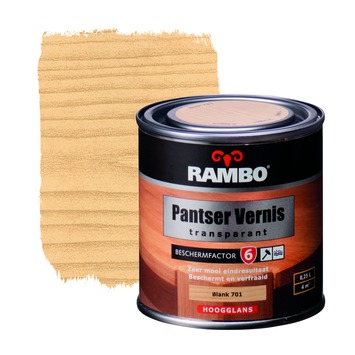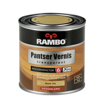 De Rambo Pantser vernis hoogglans blank 250 ml is een vernis die zorgt voor een fraaie houtafwerking. De vernis op alkydbasis geeft al je hout binnenshuis een bescherming en geeft een mooie hoogglans afwerking. Het is geschikt voor meubels, kozijnen, deuren en betimmeringen binnenshuis. Het blik bevat 250 milliliter blanke vernis, dit is genoeg voor een oppervlakte van zo'n 4 vierkante meter.