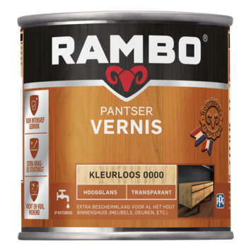 Rambo Pantser vernis hoogglans kleurloos 250 ml biedt de ideale bescherming voor (gelakte) meubels, deuren, kozijnen, lambriseringen en hout binnen. Deze lak is vocht- en vuilafstotend, en daarnaast extra kras- en slijtvast. Hij vloeit mooi uit en zorgt jaren lang voor een matte uitstraling die behouden blijft. Het is perfect voor houten deuren, kozijnen, betimmeringen en meubels binnenshuis. De dekking van dit product is 12 m² per liter.
