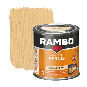 Rambo Pantser vernis hoogglans kleurloos 250 ml biedt de ideale bescherming voor (gelakte) meubels, deuren, kozijnen, lambriseringen en hout binnen. Deze lak is vocht- en vuilafstotend, en daarnaast extra kras- en slijtvast. Hij vloeit mooi uit en zorgt jaren lang voor een matte uitstraling die behouden blijft. Het is perfect voor houten deuren, kozijnen, betimmeringen en meubels binnenshuis. De dekking van dit product is 12 m² per liter.