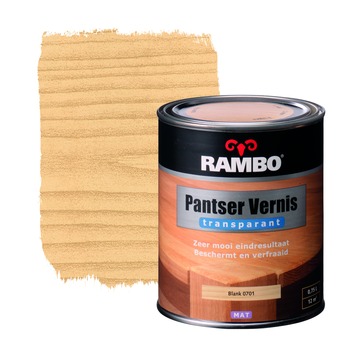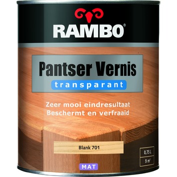 De Rambo Pantser vernis waterbasis mat blank 750 ml is een blanke lak die zorgt voor een fraaie houtafwerking. De vernis beschermt het hout binnenshuis en geeft een mooie matte afwerking. Het is speciaal geschikt voor meubels, kozijnen, deuren en betimmeringen. Het blik bevat 750 milliliter blanke vernis, dit is genoeg voor een oppervlakte van zo'n 12 vierkante meter.