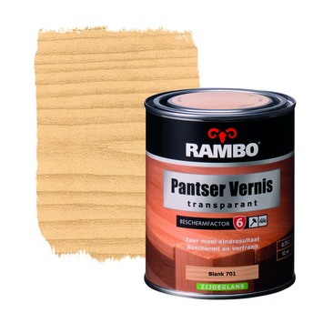 De Rambo Pantser vernis zijdeglans blank 750 ml is een vernis die zorgt voor een fraaie houtafwerking. Het beschermt het hout binnenshuis en geeft het een mooie bolle glans. De vernis is geschikt voor meubels, kozijnen, deuren en betimmeringen binnenshuis. De vernis is blank en heeft een zijdeglans. Het blik bevat 750 milliliter vernis, dit is genoeg voor een oppervlakte van 12 vierkante meter.