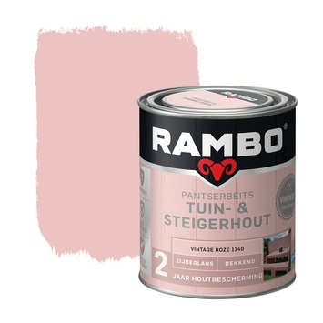 De Rambo Pantserbeits tuin- & steigerhout zijdeglans Vintage Roze geeft je hout een mooie vintage uitstraling en beschermt 2 jaar tegen alle weersomstandigheden. Deze pantserbeits kun je gebruiken voor alle houtsoorten en geïmpregneerd hout. Borstel geïmpregneerd hout wel eerst even af. Na opening van de pot goed over de bodem roeren. Gebruik de beits tussen 10 en 25° C en strijk de laatste streek in de richting van de houtnerf. Zo bereik je het optimale resultaat. Je kunt het hout zo'n 4 uur na het schilderen voorzien van een tweede laag. Hoeveel beits je nodig hebt, is afhankelijk van de structuur en de staat van de ondergrond.