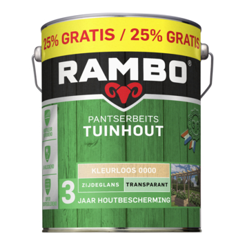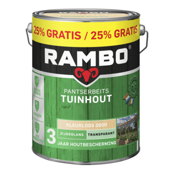 Met Rambo Pantserbeits Tuinhout zijdeglans transparant kleurloos 5 liter behandel je houten onderdelen rondom het huis die buiten staan. Denk aan pergola’s, speeltoestellen, borders, carports en prieeltjes. Deze terpentinegedragen beits is geschikt voor buitengebruik en beschermt tuinhout tot 3 jaar tegen verschillende weersinvloeden.
