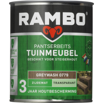 De Rambo Pantserbeits tuinmeubel zijdemat greywash transparant 750 ml geeft jouw tuinmeubelen een prachtig zijdemat resultaat dat niet afbladdert. Doordat deze pantserbeits transparant is, en een minimale hoeveelheid pigmenten bevat, blijft de kleur behouden en de houtnerf extra benadrukt. Deze pantserbeits beschermt tegen vocht en groene aanslag doordat het beschikt over Slow Release Technologie. Daardoor druppelt de beits nauwelijks en kun je er gemakkelijk mee werken. Door het schuren van het oppervlak, na het aanbrengen van de eerste laag, creëer je een stijlvol en glad oppervlak dat je gemakkelijk schoonmaakt. Deze Pantserbeits beschermt jouw tuinmeubelen tegen de schadelijke effecten van Uv-stralen, wind en regen. Daardoor blijven de meubelen langer mooi en verleng je de levensduur van de tuinmeubelen. Je kunt deze pantserbeits gebruiken op alle houtsoorten, behalve merbau. Ook op geïmpregneerd hout kun je deze beits aanbrengen, maar het is dan aan te raden om dit eerst af te borstelen.