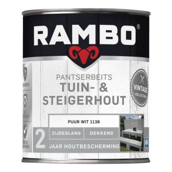 De Rambo Pantserbeits Vintage tuin- en steigerhout zijdeglans dekkend puur wit 750 ml geeft je hout een mooie vintage uitstraling en beschermt 2 jaar tegen alle weersomstandigheden. Deze pantserbeits kun je gebruiken voor alle houtsoorten en geïmpregneerd hout. Borstel geïmpregneerd hout wel eerst even af. Na opening van de pot goed over de bodem roeren. Gebruik de beits bij 10 tot 25 graden celsius en strijk de laatste streek in de richting van de houtnerf. Zo bereik je het optimale resultaat. Je kunt het hout zo'n 4 uur na het schilderen voorzien van een tweede laag. Hoeveel beits je nodig hebt, is afhankelijk van de structuur en de staat van de ondergrond.