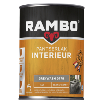 Rambo pantserlak interieur transparant mat greywash 1,25 l is dankzij de gepatenteerde DB® technologie extra kras- en stootvast. Dit maakt dat deze lak bijzonder geschikt is voor schilderwerk dat tegen een stootje moet kunnen. Rambo Pantserlak Interieur is geurarm, vocht- en vuilwerend en geschikt voor meubels, lambriseringen, deuren, kozijnen en hout binnenshuis. Het rendement van dit product is 10 tot 14 m2 per liter.