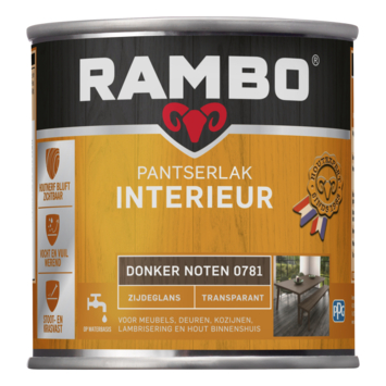 Rambo pantserlak interieur transparant zijdeglans donker noten 250 ml is dankzij de gepatenteerde DB® technologie extra kras- en stootvast. Dit maakt dat deze lak bijzonder geschikt is voor schilderwerk dat tegen een stootje moet kunnen. Rambo Pantserlak Interieur is geurarm, vocht- en vuilwerend en geschikt voor meubels, lambriseringen, deuren, kozijnen en hout binnenshuis. Het rendement van dit product is 10 tot 14 m2 per liter.