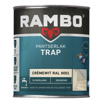 Rambo pantserlak trap dekkend zijdeglans cremewit 750 ml is geurarm, vergeelt niet en droogt extra snel. Trappen krijgen veel te verduren, daarom is er Rambo Pantserlak Trap. De lak biedt langdurige bescherming met een blijvende zijdeglans, vloeit mooi uit en is zeer kras- en slijtvast. Geschikt voor zowel de trap als de trapopbouw. Dit product heeft een rendement van 12 m² per liter.