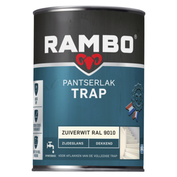 Rambo pantserlak trap dekkend zijdeglans cremewit 750 ml is geurarm, vergeelt niet en droogt extra snel. Trappen krijgen veel te verduren, daarom is er Rambo Pantserlak Trap. De lak biedt langdurige bescherming met een blijvende zijdeglans, vloeit mooi uit en is zeer kras- en slijtvast. Geschikt voor zowel de trap als de trapopbouw. Dit product heeft een rendement van 12 m² per liter.