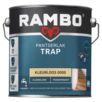 Houten trappen krijgen veel te verduren, en daarom is er de extra sterke Rambo Pantserlak Trap zijdeglans transparant kleurloos 2,5 liter. Deze lak droogt snel, is geurarm en vergeelt niet. Daarnaast is hij zeer kras- en slijtvast, vloeit mooi uit en zorgt jarenlang voor een blijvende zijdeglans. Geschikt voor zowel de trap als de trapopbouw. Het rendement bedraagt 12 m² per liter.