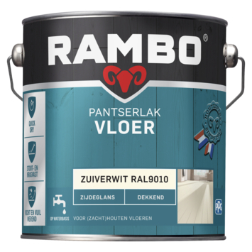 Rambo Pantserlak vloer acryl zijdeglans dekkend zuiverwit 2,5 liter biedt bescherming voor (zacht)houten vloeren. Geef je vloer extra stevigheid met deze speciaal door Rambo ontwikkelde dekkende acrylvloerlak. De lak droogt snel, is geurarm en vergeelt niet. Daarnaast is de lak zeer kras- en slijtvast. Het product vloeit mooi uit en biedt langdurige bescherming met een blijvende zijdeglans. Het rendement bedraagt 12 m² per liter.