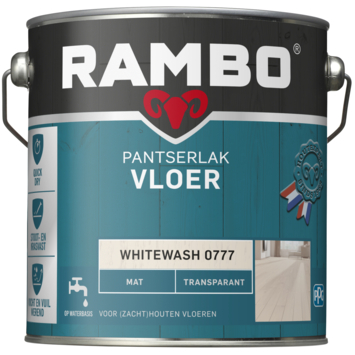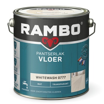 Rambo Pantserlak vloer mat transparant whitewash 2,5 liter beschermt (zacht)houten vloeren en behoudt tegelijk het natuurlijke houtkarakter. Deze door Rambo ontwikkelde transparante acrylvloerlak biedt extra bescherming. De lak droogt snel, is geurarm en vergeelt niet. Bovendien is het product zeer kras- en slijtvast. De lak vloeit mooi uit en zorgt jarenlang voor een matte uitstraling. Het rendement bedraagt 12 m² per liter.