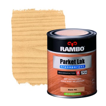 De Rambo parketlak waterbasis zijdeglans blank 750 ml is een lak speciaal voor parket en hardhouten vloeren. De lak is kras- en slijtvast en kan dus tegen een stootje. De lak heeft een blanke kleur en heeft een zijdeglans afwerking. Daarnaast is de lak op waterbasis makkelijk aan te brengen, droogt het snel en is het reukarm. Het blik bevat 750 milliliter lak, dit is genoeg voor een oppervlakte van zo'n 12 vierkante meter.