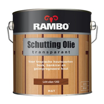 De Rambo schutting olie licht eiken transparant 2,5 l is een hoogwaardige olie voor hardhout. Het beschermt het hout tegen vocht en verwering. De olie is geschikt voor schuttingen, tuinbanken, plantenbakken en tuinhout. De olie geeft het hout een mooie uniforme kleur en voorkomt vergrijzing. Het blik bevat 2,5 liter licht eiken transparante olie, dit is genoeg voor een oppervlakte van zo'n 38 vierkante meter.