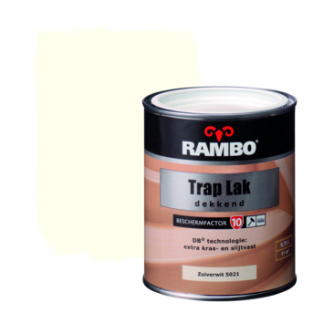 De Rambo traplak zuiver wit dekkend 750 ml is een lak die de beste bescherming biedt aan trappen, trapopbouwdelen en betimmeringen. De lak is kras- en slijtvast, vergeelt niet en is reukarm. Daarnaast is de lak makkelijk aan te brengen en droogt het snel. Het blik bevat 750 milliliter zuiver witte dekkende lak, dit is genoeg voor een oppervlakte van zo'n 12 vierkante meter.